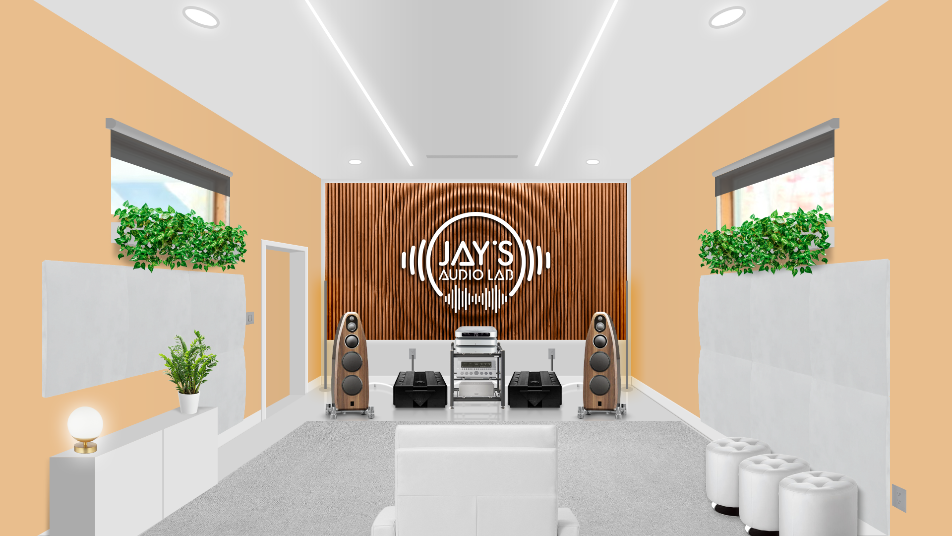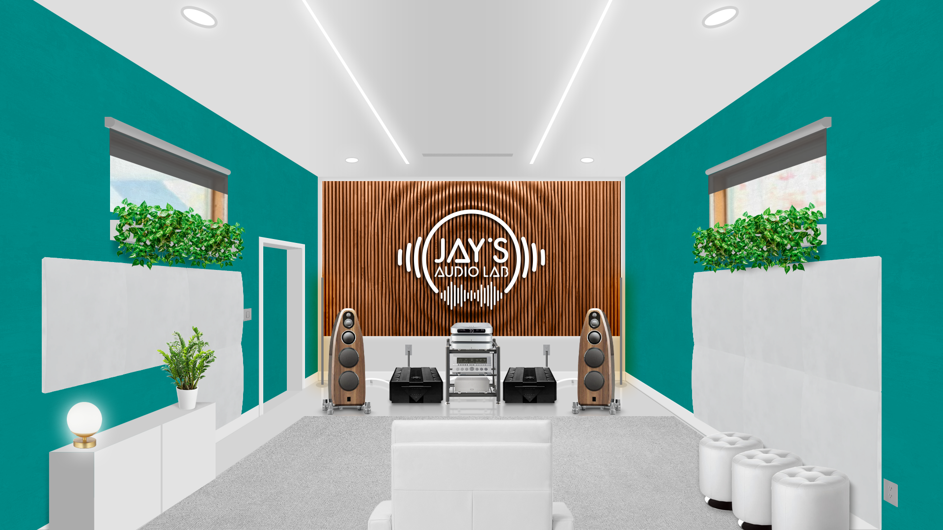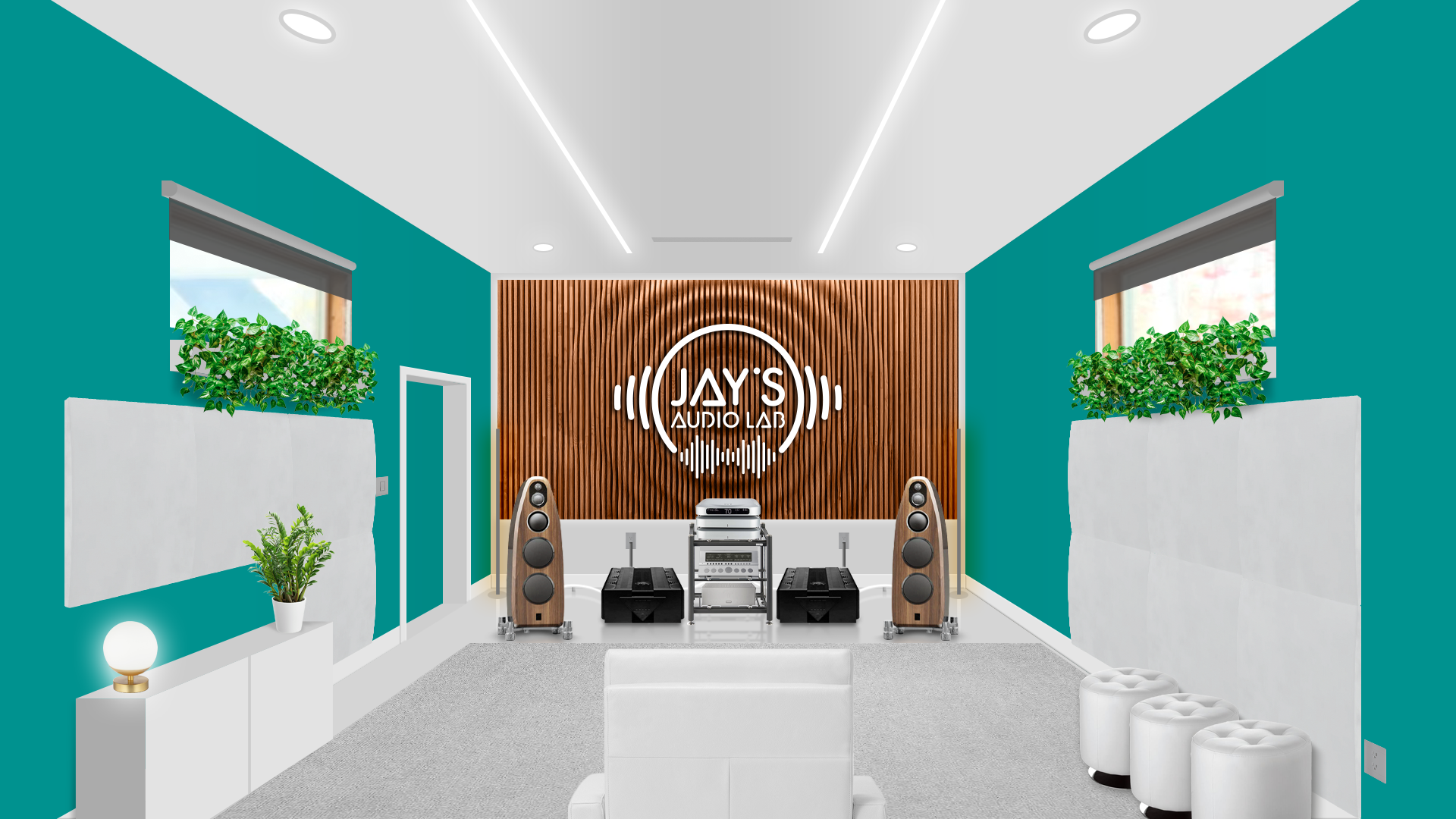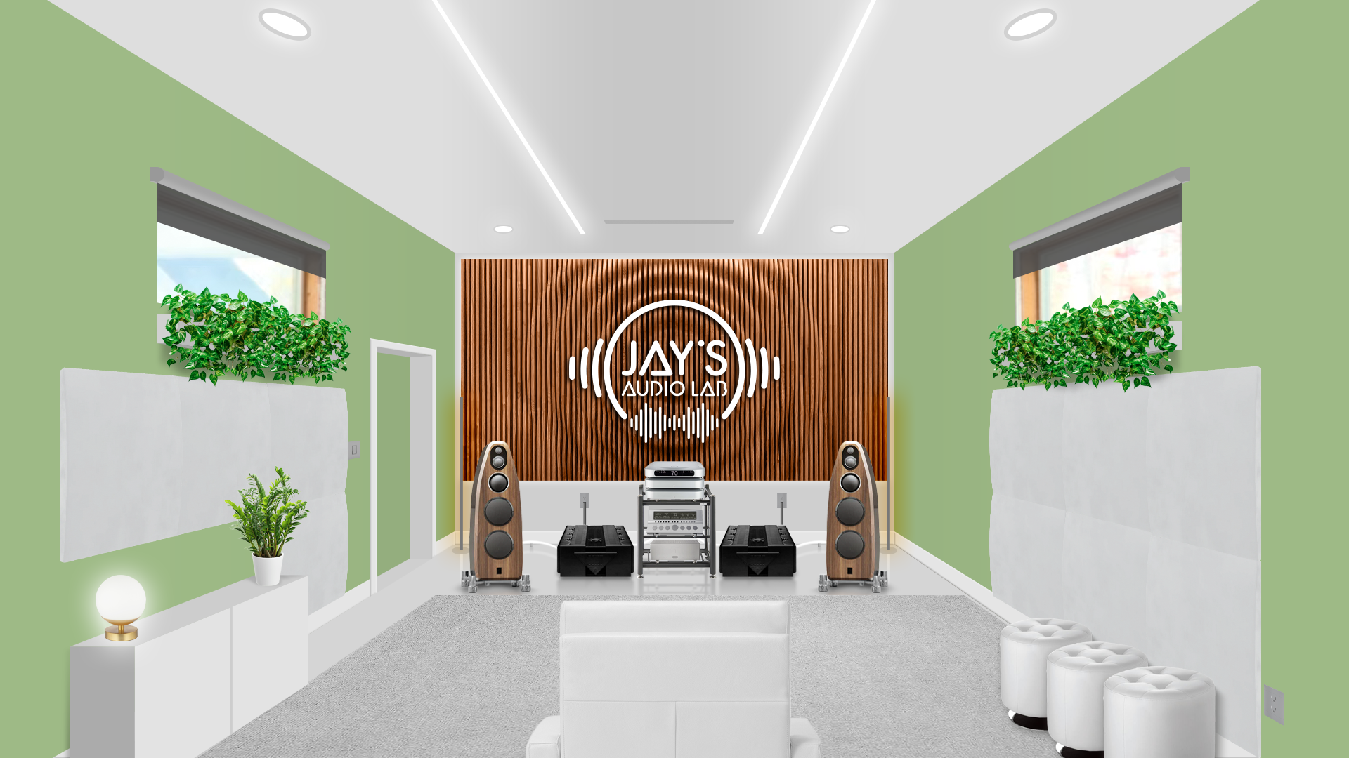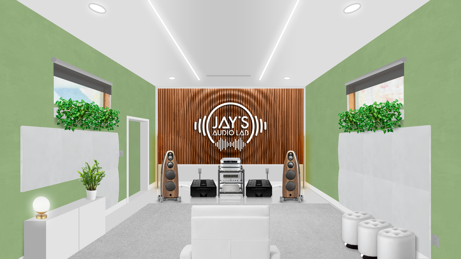 The chosen decor follows a personal taste. I took the liberty to set the room without any official guideline. It’s just an exercise of style. Plants (Pothos, a non demanding plant that grows usually without problems), ottomans, cabinet, rug, blinds, front and side sound treatment are just hypothetical. The wooden wall on the front wall is a Parametric Wall by Ekustik. I think it would be a nice addition, both acoustically and esthetically. The carved (by CNC machines, for example) and white painted logo applied on it would furthermore add a personal touch. It could be made in wood as well to avoid any acoustical annoyances.