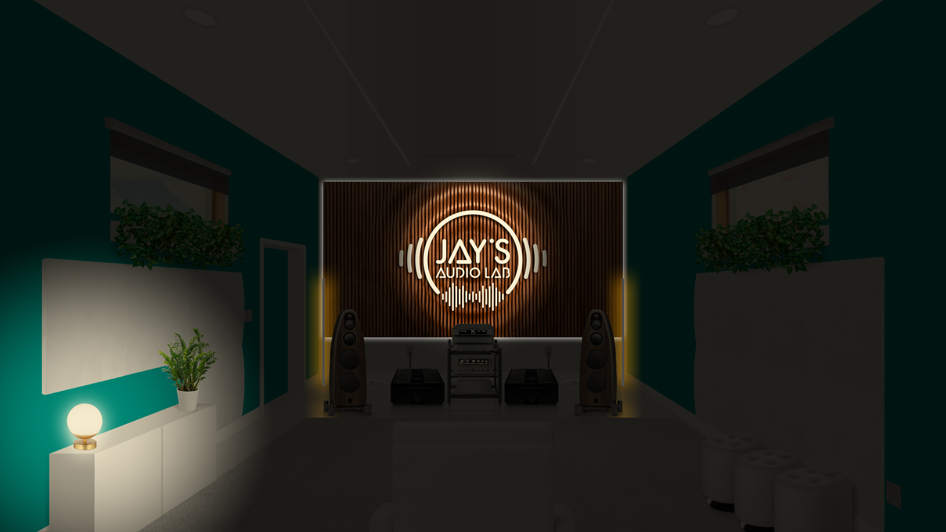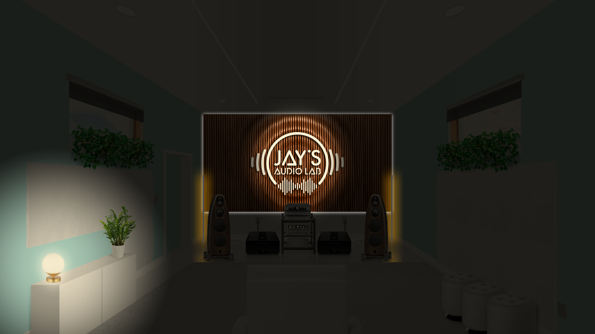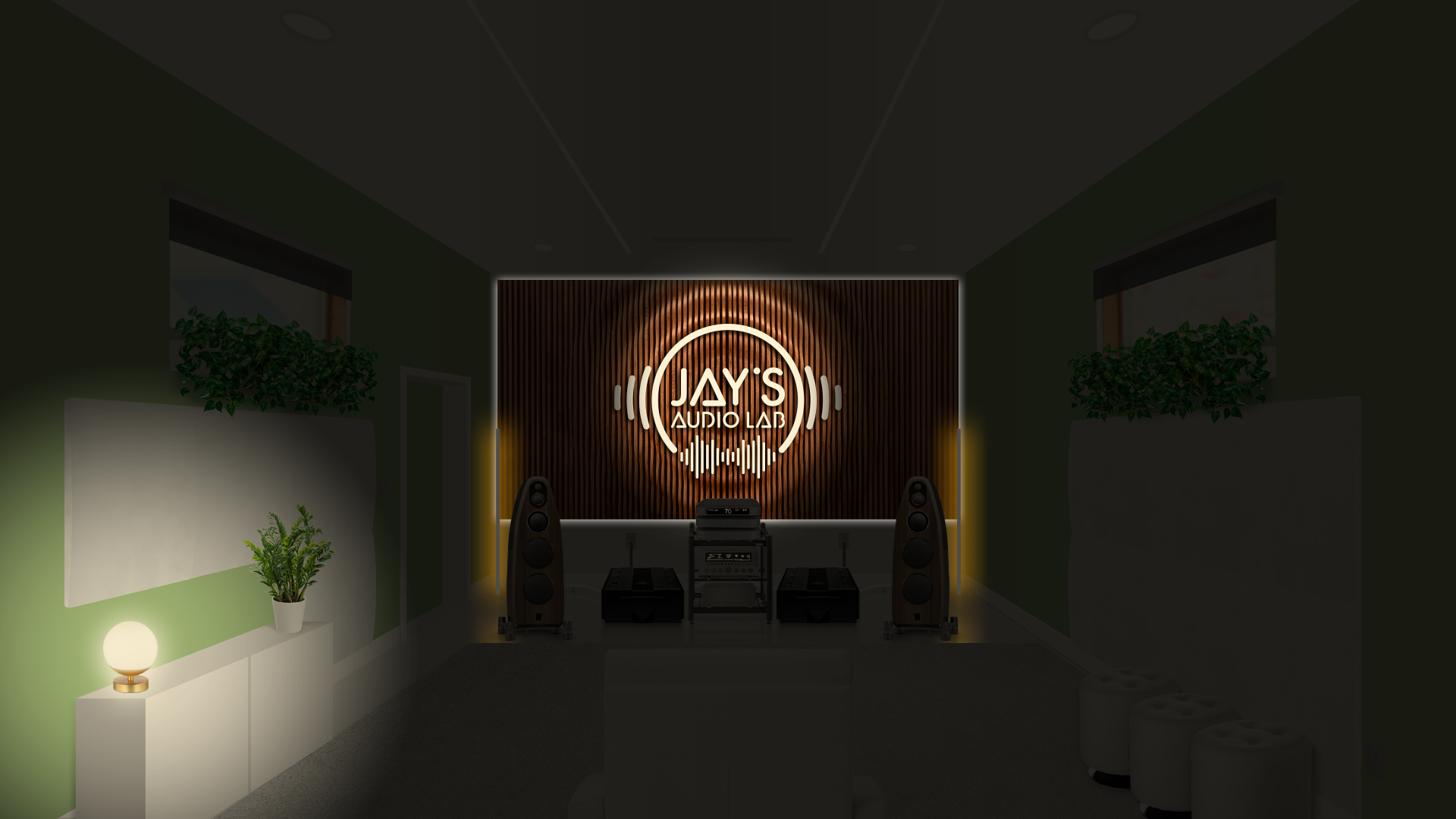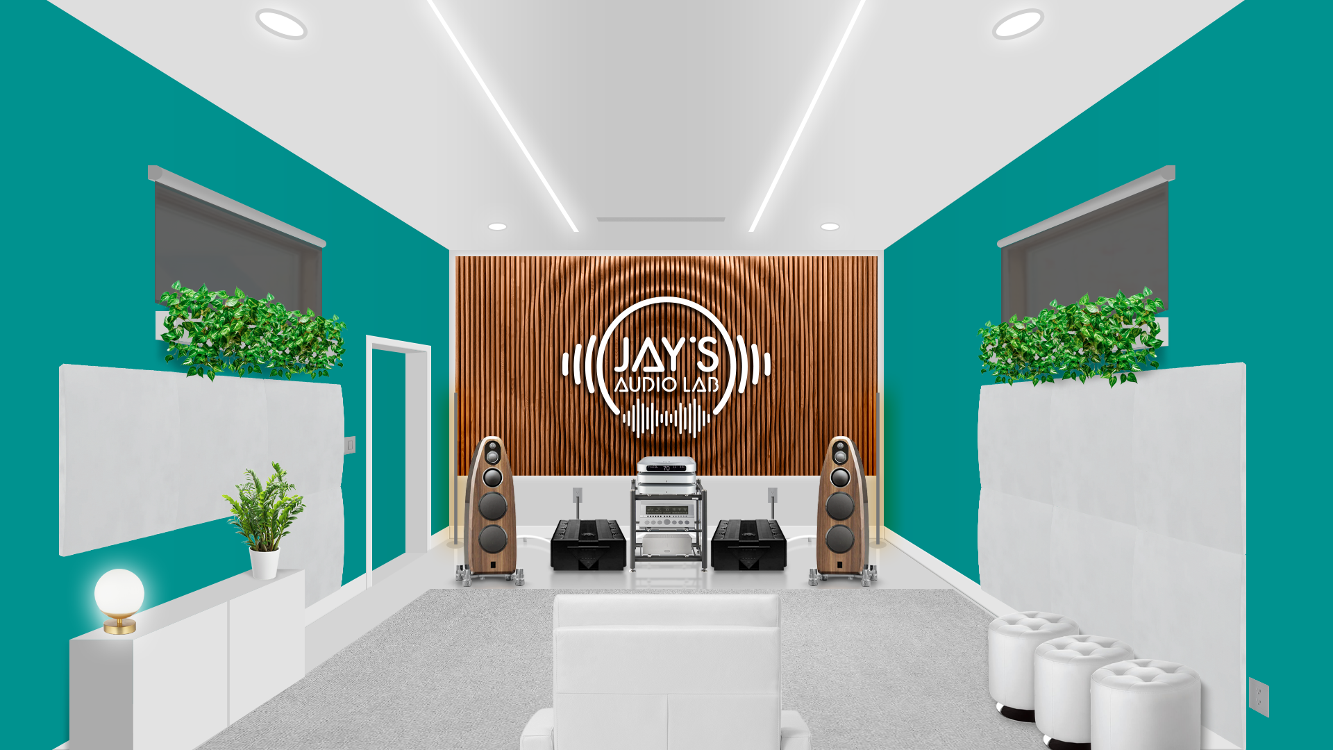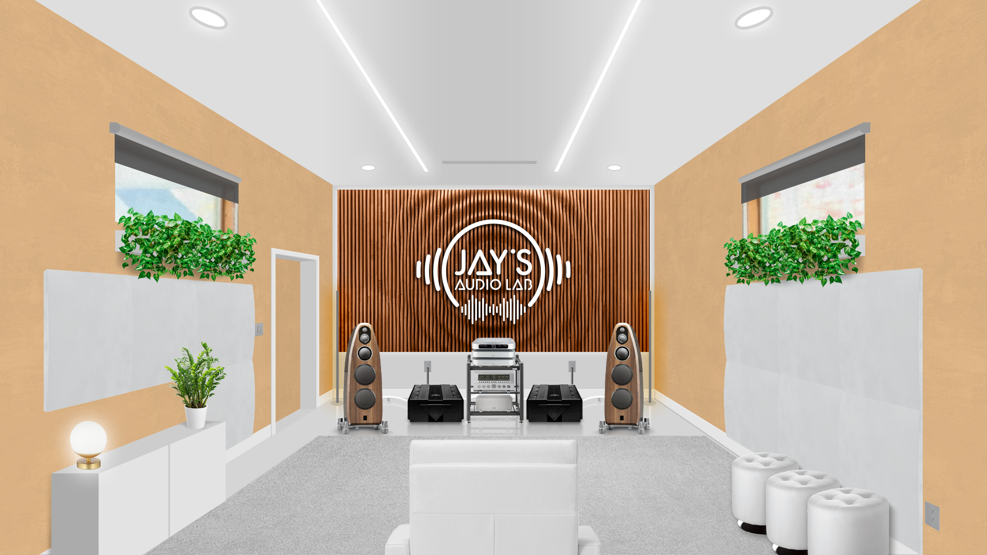 The chosen decor follows a personal taste. I took the liberty to set the room without any official guideline. It’s just an exercise of style. Plants (Pothos, a non demanding plant that grows usually without problems), ottomans, cabinet, rug, blinds, front and side sound treatment are just hypothetical. The wooden wall on the front wall is a Parametric Wall by Ekustik. I think it would be a nice addition, both acoustically and esthetically. The carved (by CNC machines, for example) and white painted logo applied on it would furthermore add a personal touch. It could be made in wood as well to avoid any acoustical annoyances.